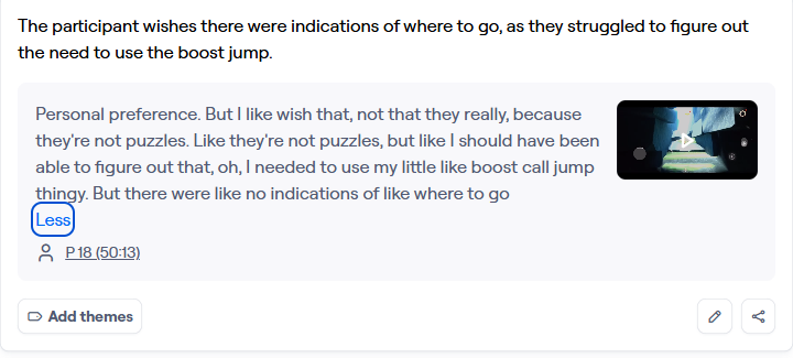 Still, there was certain functionality that the software provided that would be extremely useful for a UX researcher. Despite not always being 100 percent accurate, transcriptions can provide an easily searchable script of the playtest, allowing the researcher to easily find the correct moment in the video. Lastly, the speed at which the AI performs its analysis is significantly faster than human research, taking less than an hour instead of over 1 week of a standard User Behavioristics study. This shows that AI is best at time-consuming, monotonous work, allowing researchers to save valuable time to focus on creative insights that AI is not as good at.